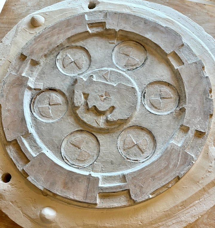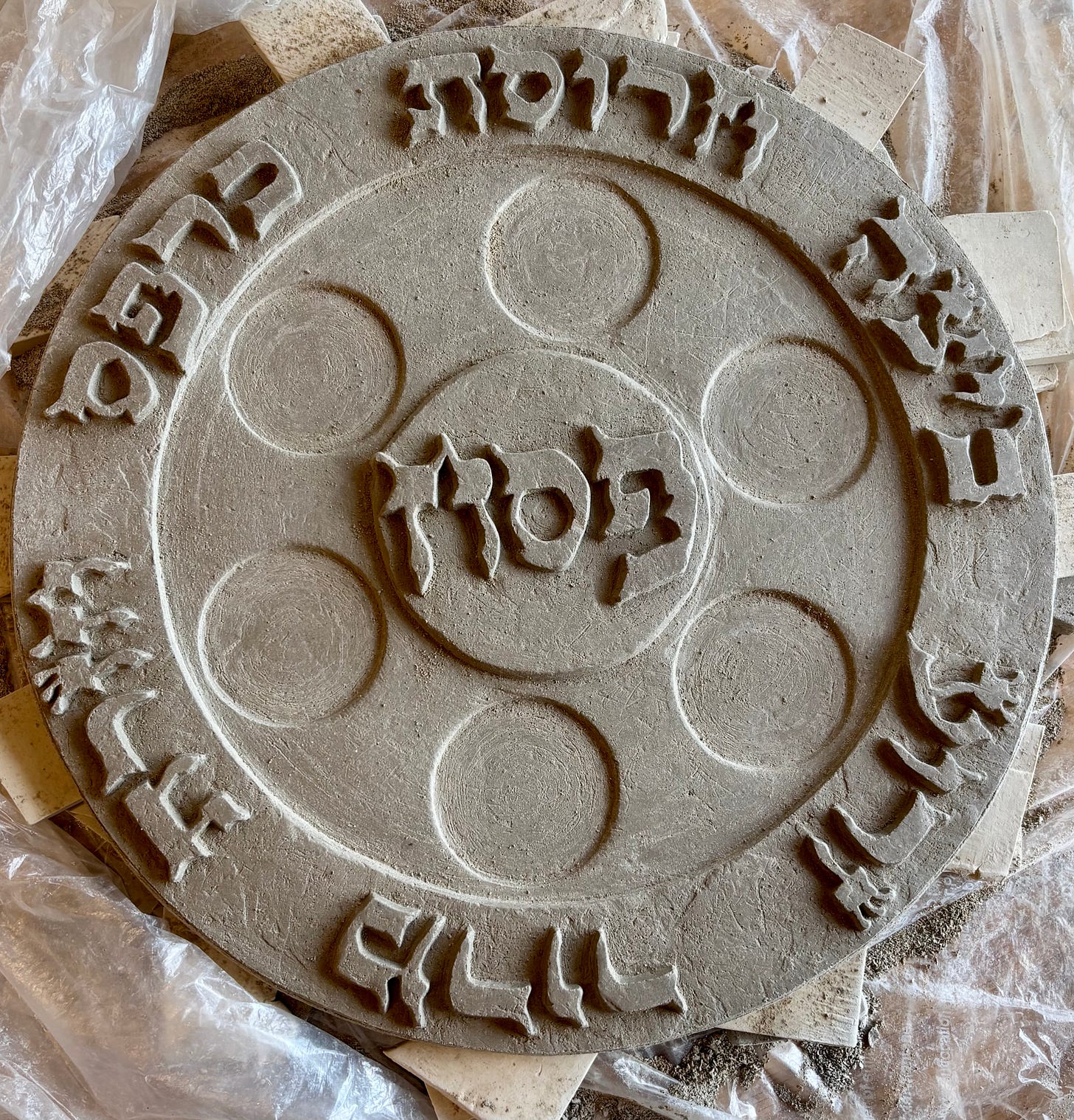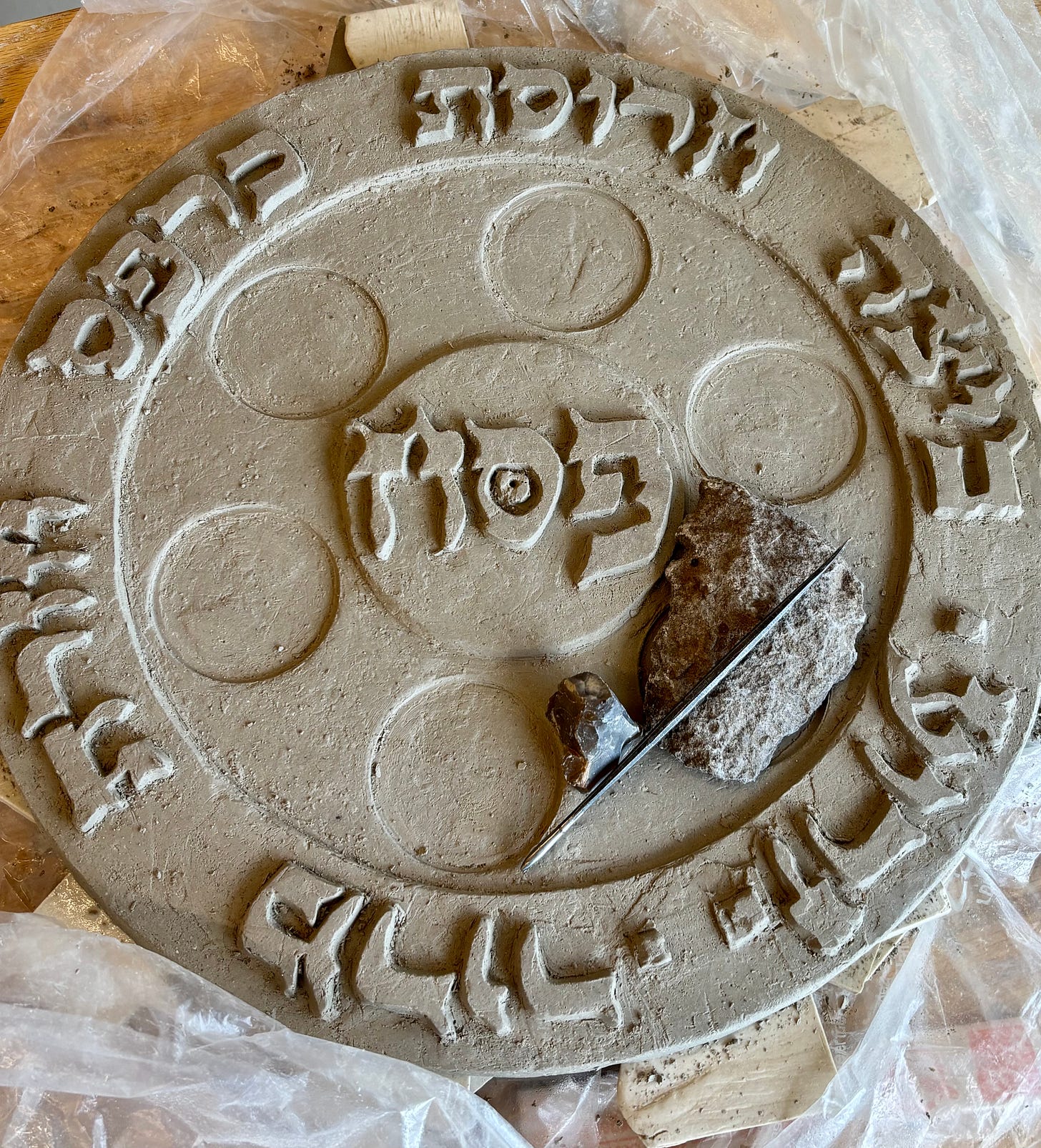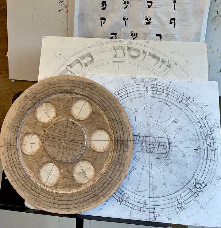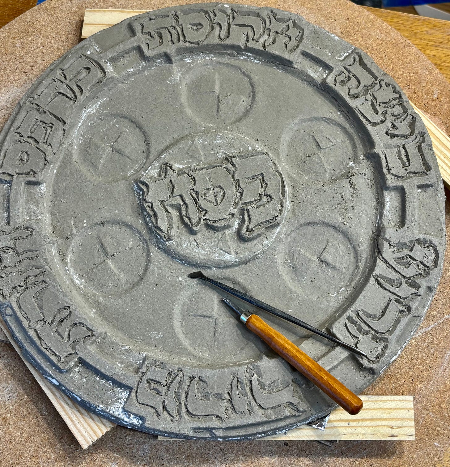 I had been itching for some time, to carve a seder plate this way in clay. To do this, I built a wooden seder plate to approximate my intended design. I then replicated this approximation in clay with a plaster mold that I created for this purpose.