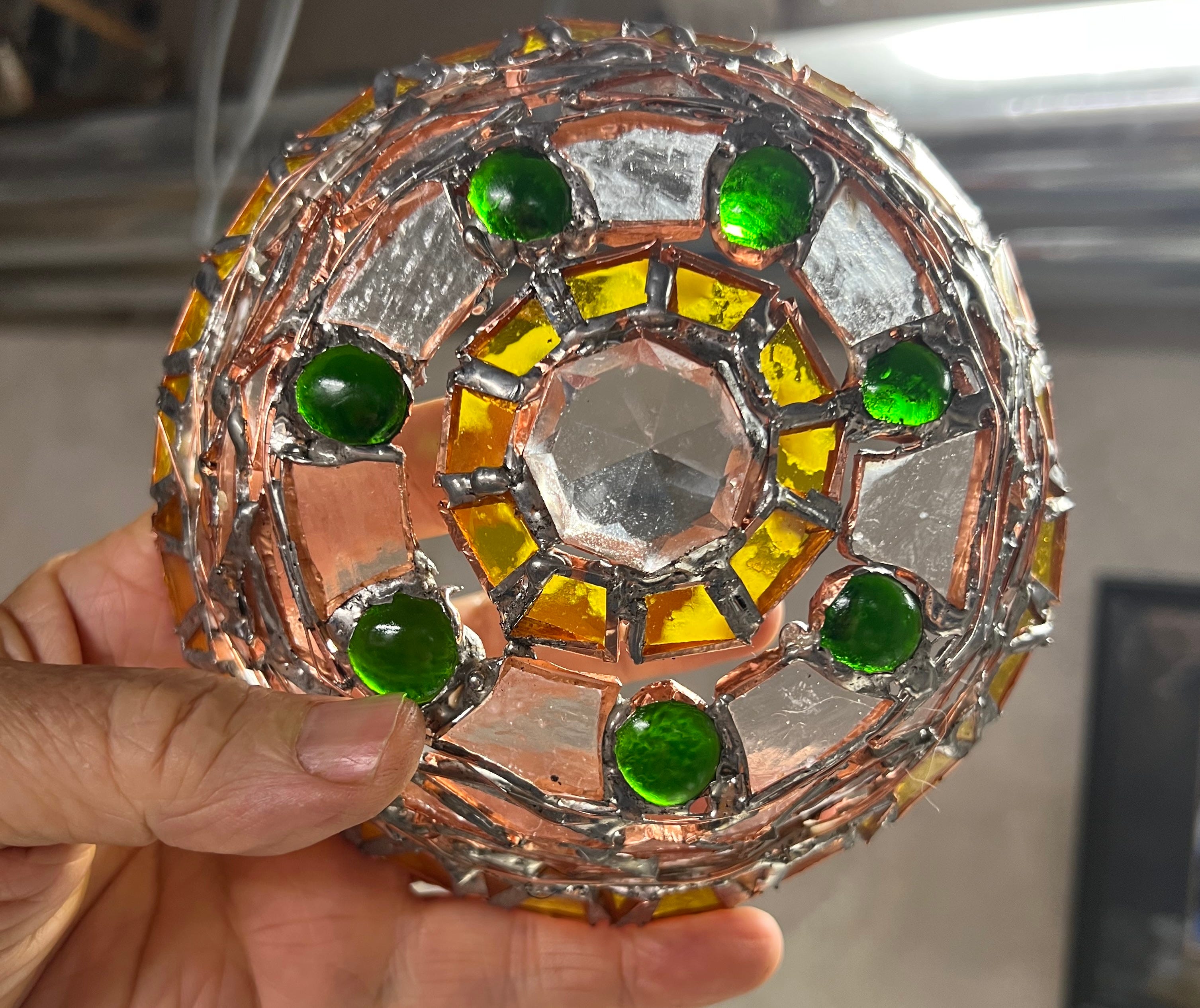 In Process - the underside of the Eternal Light - cut stained glass with crystal beads set in copper and then in bronze.