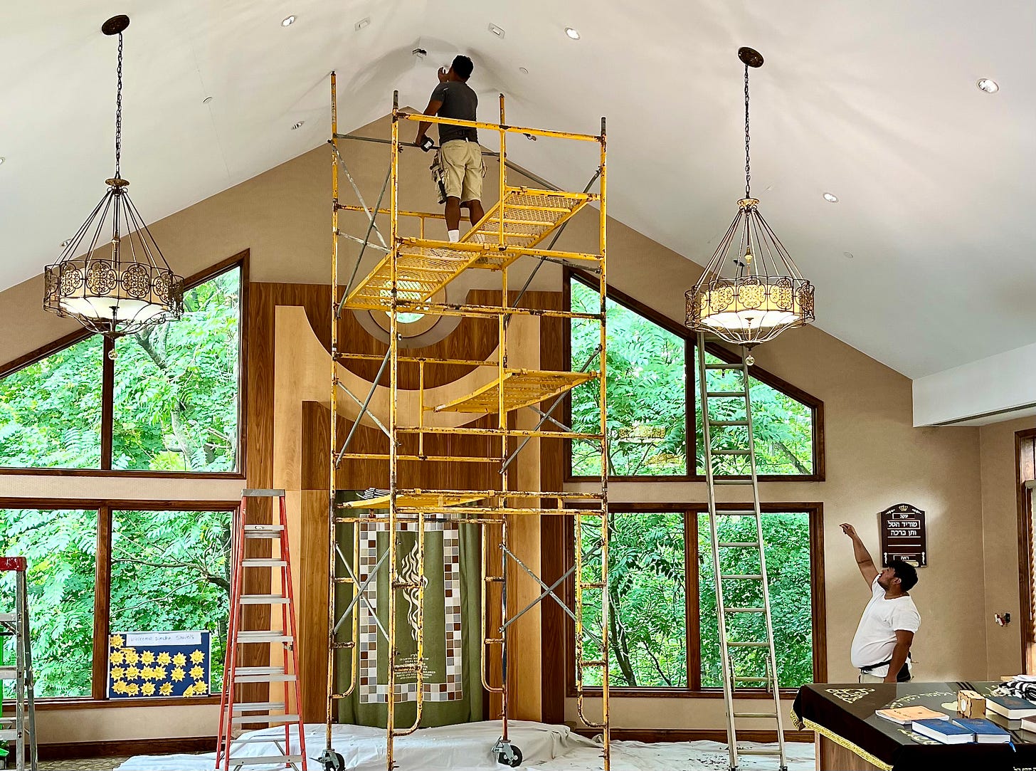 The full-scale 3-D model gave us a life size visual of how the actual light would look. I wanted to see the model in the sanctuary, positioned in the way the actual Eternal Light would hang. I was excited to see how it would visually relate to the architecture and interior design with contrasting modern and traditional elements. There was still a question of where to hang it — both vertically and horizontally relative to the ridge of the vaulted ceiling, the port-hole window and the Holy Ark. With the ridge of the vaulted ceiling way above ladder access, I had no idea how this was going to be accomplished.