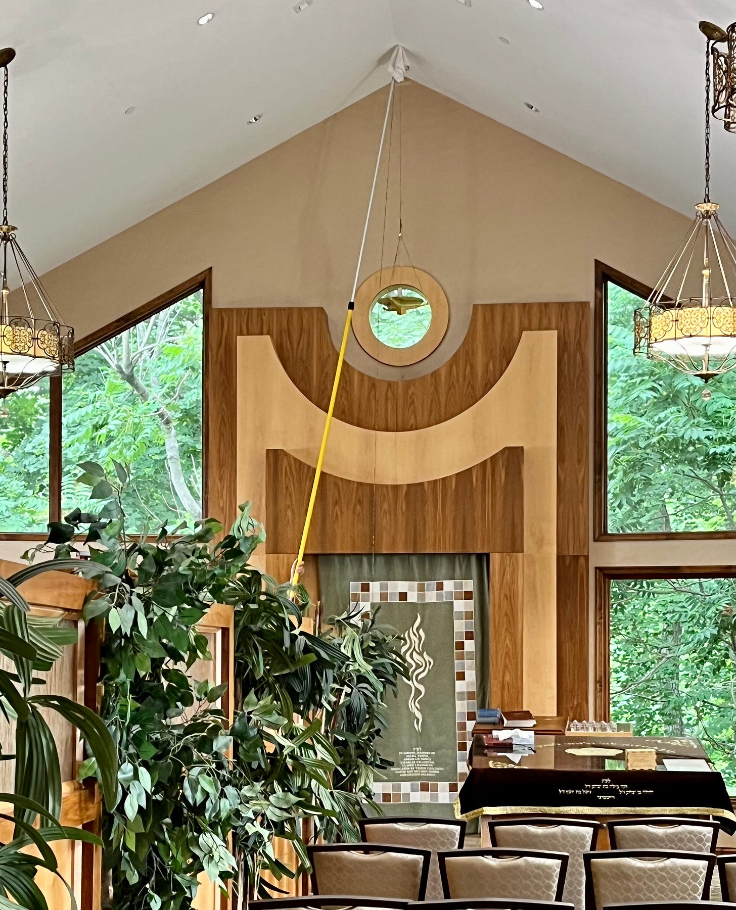 I went to the Shul to ponder the feel of the space in the sanctuary. And again to my surprise, I saw a housekeeper dusting the high vaulted ceiling with a very long extension pole. “OMG!”, I thought. “This is how I’ll hang my model! And, it worked! We were able to view the model in the space and in multiple positions relative to the Ark and the port-hole window above it. We settled on a spot where both the model and its placement looked spectacular!